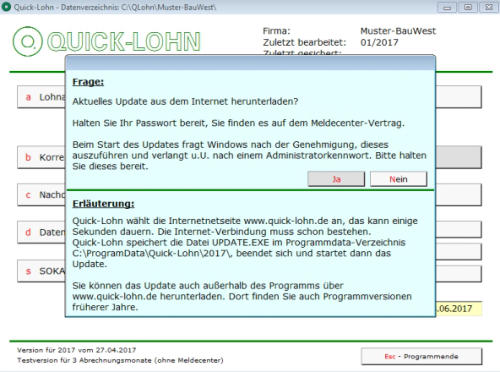 1. Bitte starte Sie Quicklohn und wählen Sie aus dem Auswahlmenu den Punkt "f - Update-Service" an.